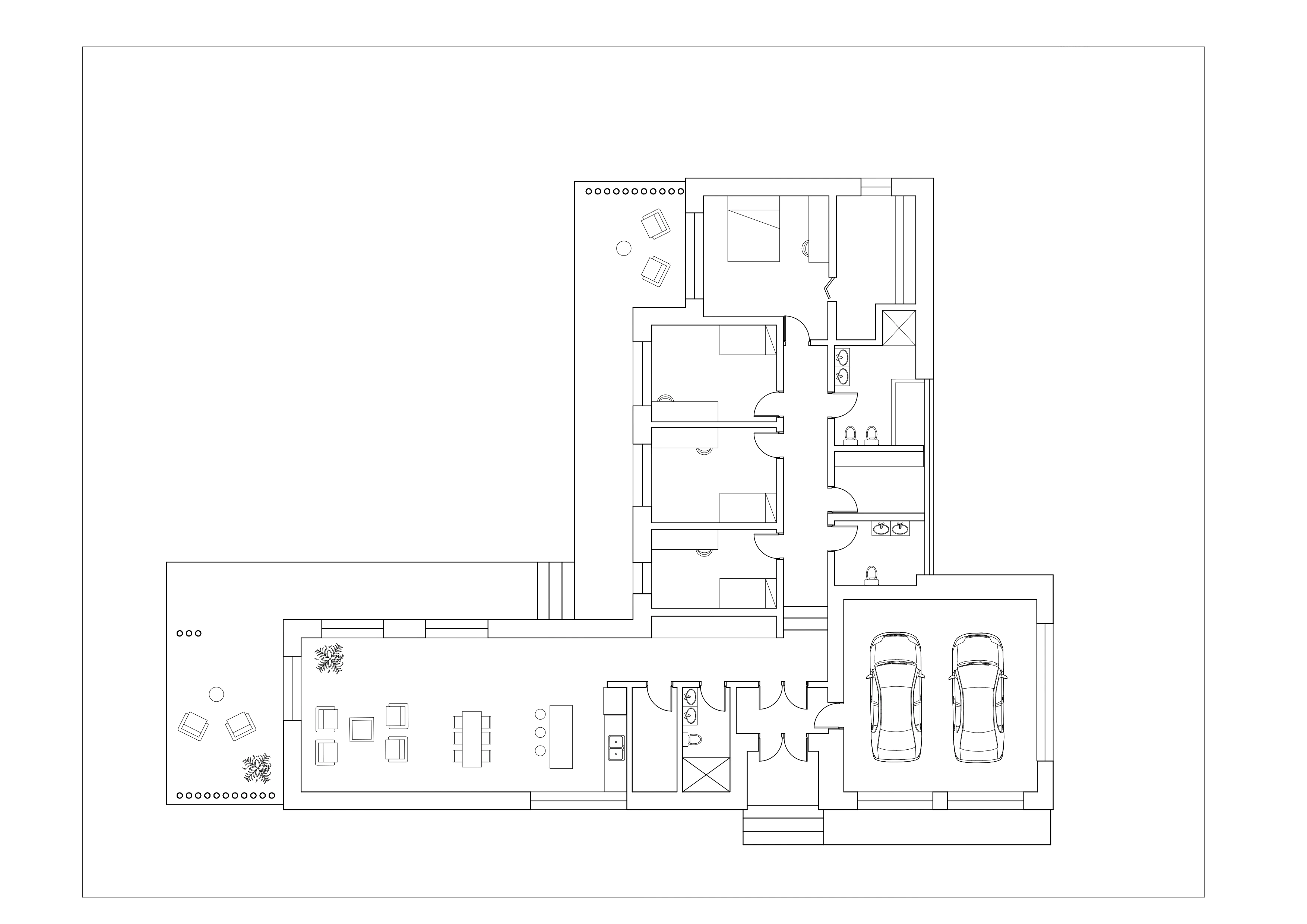 The L-shaped design separates private and communal spaces, reducing noise and increasing comfort.